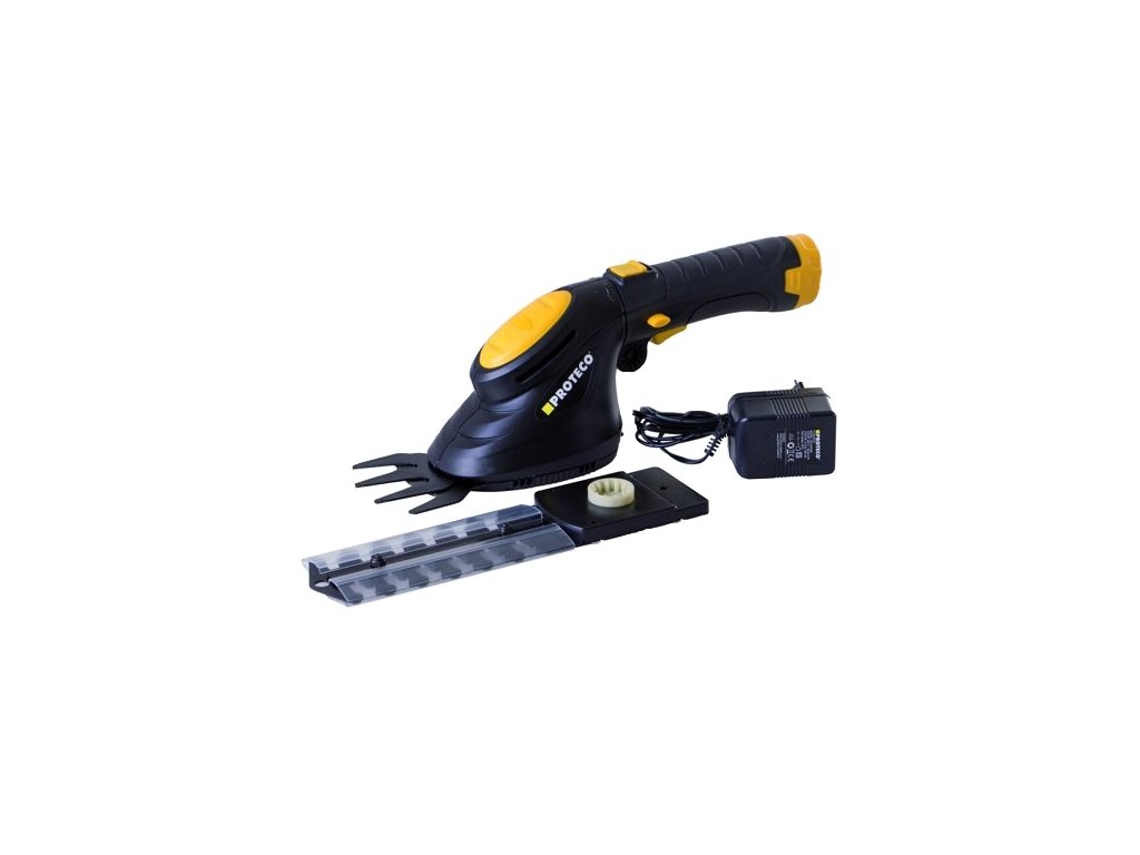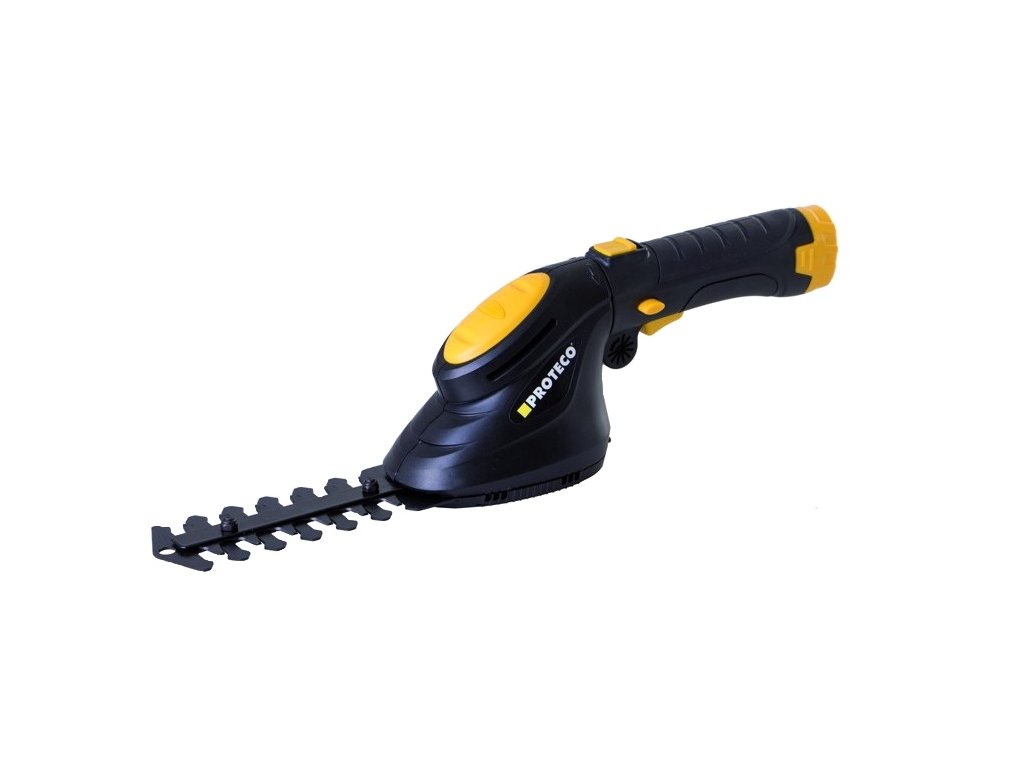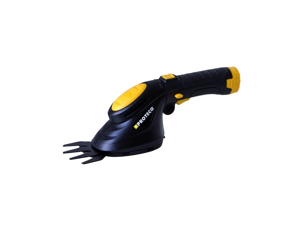 Akumulátorové nůžky na trávu Proteco jsou vhodné pro tvarování, stříhaní a zastříhávání trávníku, kam se nedostanete například se sekačkou. Nůžky disponují nožem na trávu 70 mm a na keře 110 mm. Pro pohodlnou práci lze rukojeť natočit o 90°. Pro případ zaseknutí větve v noži nebo v liště jsou nůžky vybaveny bezpečnostní elektronikou, která odpojením akumulátoru zabrání poškození motoru nebo převodovky.
