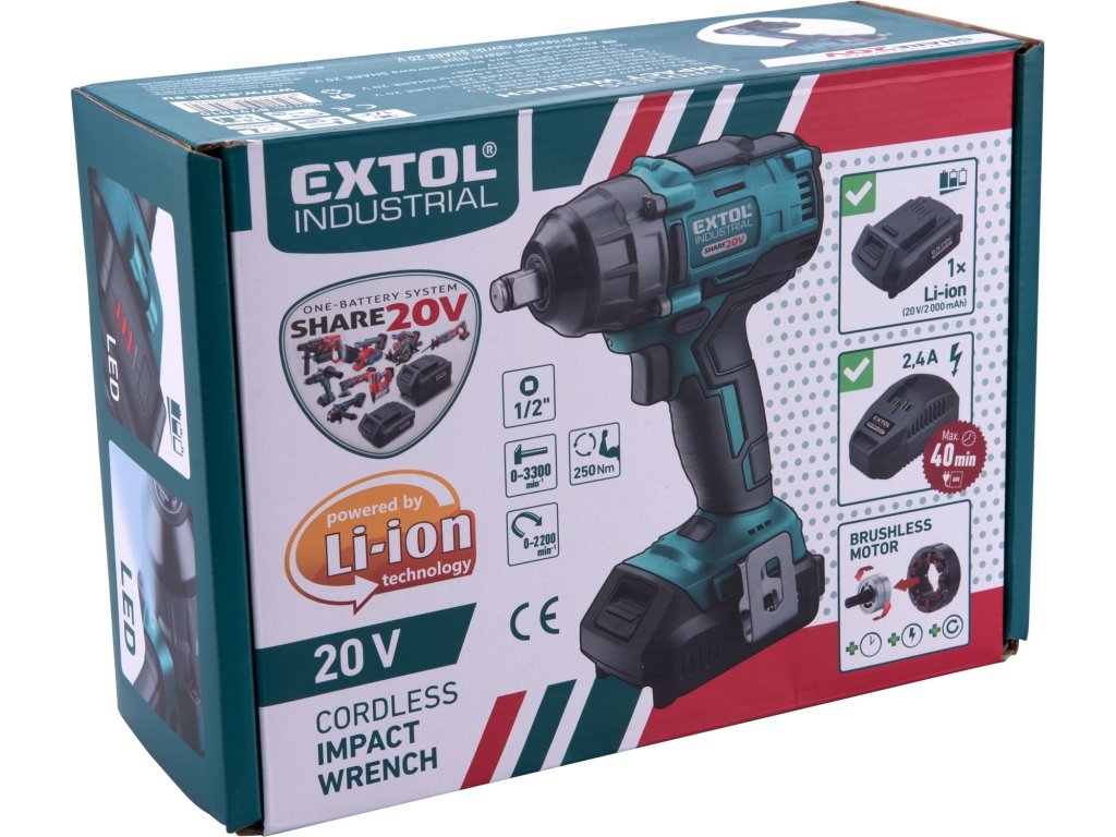 Aku utahovák EXTOL INDUSTRIAL, 1/2“ aku SHARE20V, 250Nm, BRUSHLESS, 20V Li-ion, 2000mAh