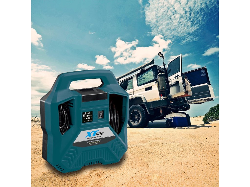 Bezolejový kompresor slouží pro huštění pneumatik osobních automobilů, jízdních kol, huštění míčů, nafukovacích hraček, člunů nebo pro ofukování pracovních stolů a ploch. Praktická přihrádka s bohatým příslušenstvím nástavců. Součástí produktu taktéž vzduchová hadice s manometrem.