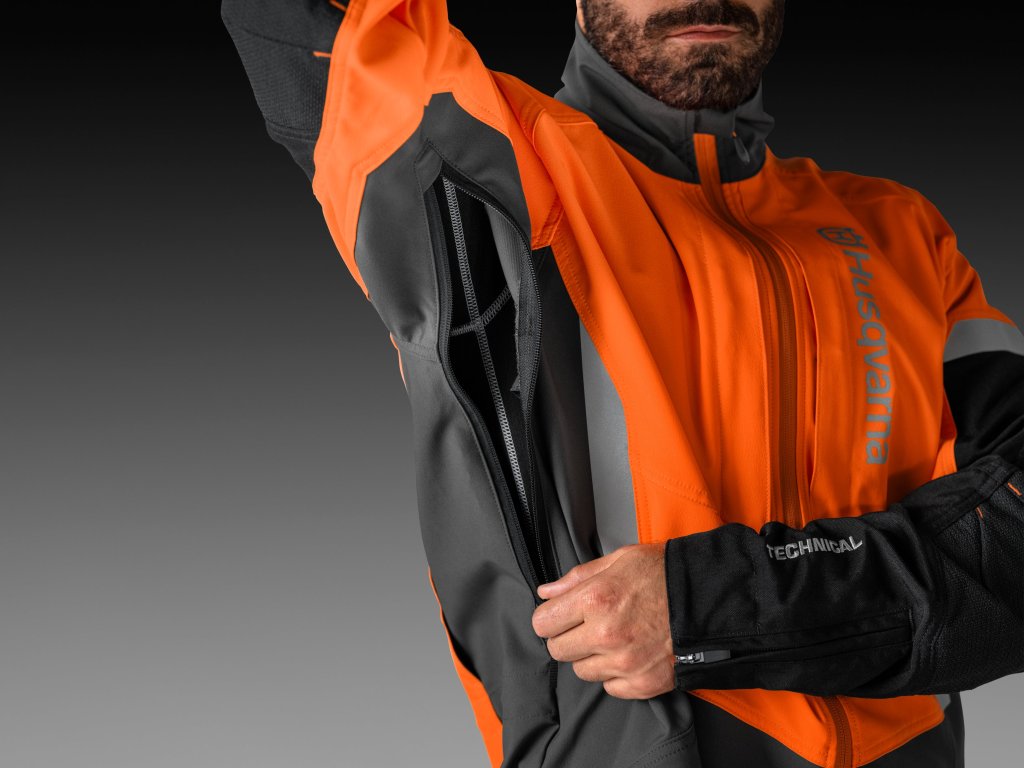 Bunda Husqvarna Technical na práci v lese nabízí mimořádnou odolnost díky materiálům, které snesou náročné každodenní používání. Na loktech je zesílena mimořádně odolnou tkaninou Dyneema®, která prodlužuje životnost. Přiléhavý střih s nastavovacími prvky a čtyřsměrná strečová tkanina zajišťují pohodlný pohyb s menší námahou. Regulace teploty je snadná díky chladicí rychleschnoucí síťovině v horní části zad a odvětrávacím zipům v podpaží.