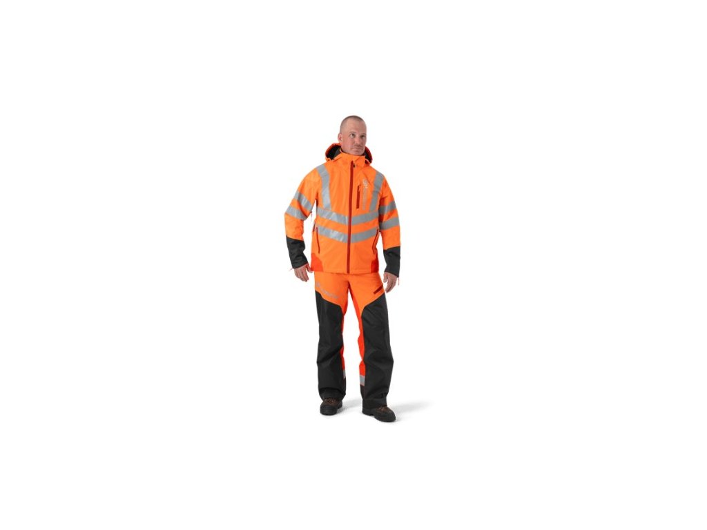 Vysoce kvalitní bunda do deště s extra zesílením v exponovaných místech. Bunda je vodoodpudivá, ale prodyšná. Je ušita z odolného polyesteru s mechanickým napínáním. Má odepínatelnou kapuci a je nastavitelná v pase a ve spodním lemu bundy pro dokonalé přizpůsobení. Kapsy jsou opatřeny vodotěsným zapínáním na zip pro bezpečné uložení věcí. Laminované a podlepené švy zajišťují nepropustnost spojů. Schváleno podle EN ISO 20471 třída 3 a EN343. Velikost XS-XXL.
