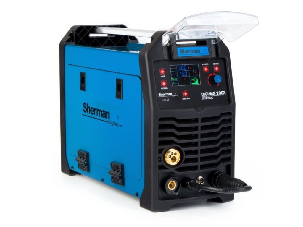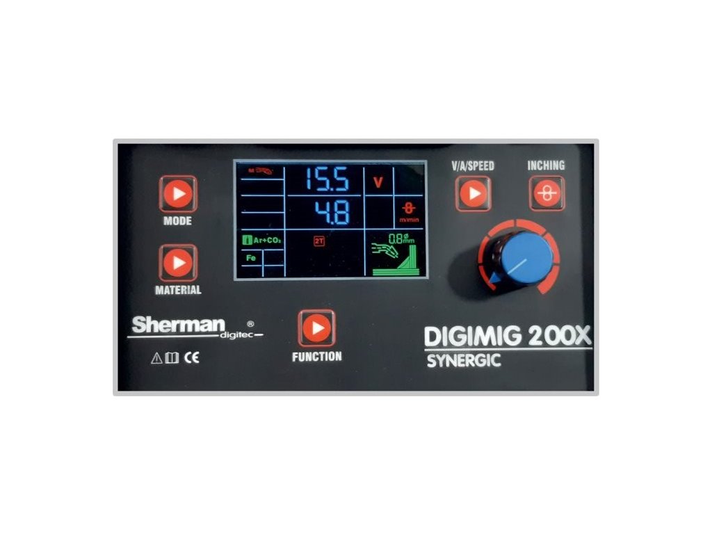 Synergické svářecí zařízení SHERMAN DIGIMIG 200X je je prvotřídní, technologicky vyspělý synergický poloautomat vybavený moderními tranzistory IGBT pro ruční svařování oceli a barevných kovů metodami MIG / MAG, MMA (obalovaná elektroda) a Lift TIG. Zařízení lze také použít pro svařování tenkých pozinkovaných (prvků do 3 mm) pájením drátů CUSI3