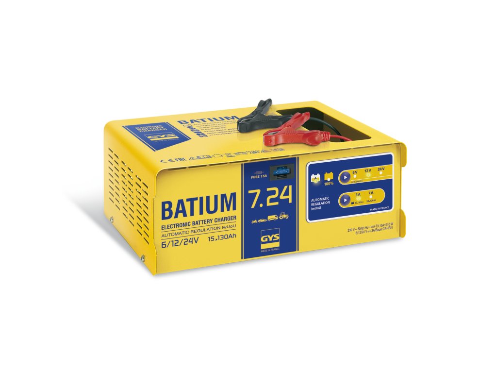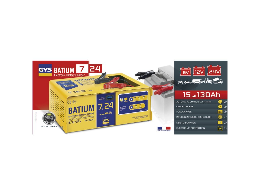 Automatická nabíječka řízena mikroprocesorem GYS BATIUM 7/24 pro 6V, 12V a 24V autobaterie s kapacitou 15-130Ah. Vhodná pro motocykly, osobní vozidla, dodávky i zemědělské a stavební stroje.