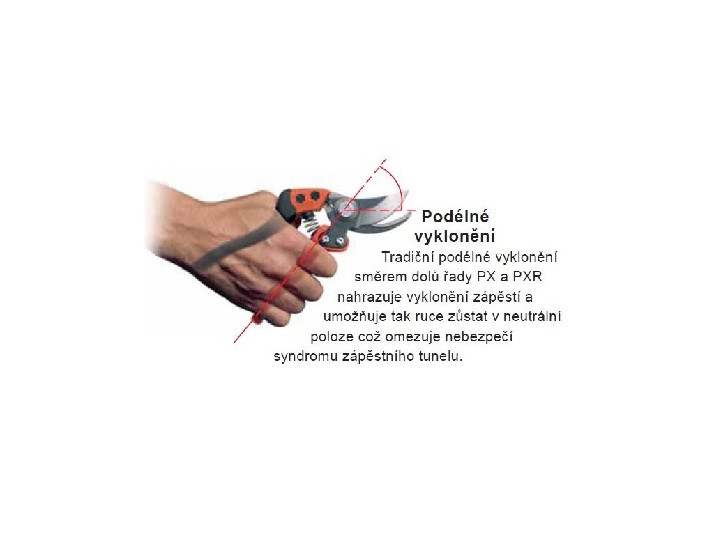 Svislý a boční sklon střižné hlavy pomáhá udržet paži i zápěstí při střihu v jedné rovině, snižuje tak únavu a bolest a zlepšuje pohodlí při práci.