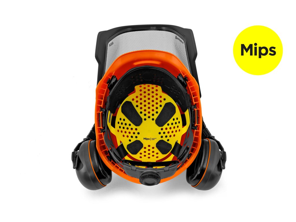 Přilba Husqvarna Technical vybavená bezpečnostním systémem Mips® pro lesnické přilby. Systém Mips® umožňuje pohyb uvnitř přilby, což v určitých nárazech pod úhlem pomáhá přesměrovat rotační pohyb od hlavy.