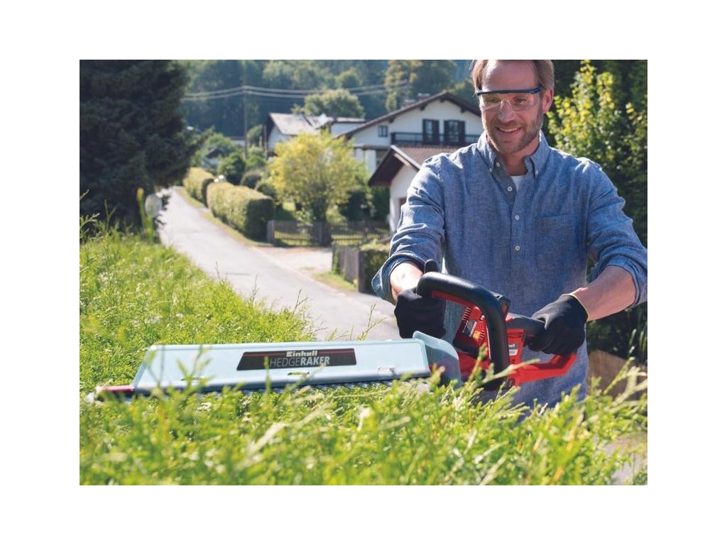 Aku nůžky na živý plot Einhell ARCURRA 18/55 jsou vysoce výkonným členem rodiny Power X-Change od firmy Einhell. Inovativní řada PXC boduje silným výkonem a maximální flexibilitou: Lithium-iontové baterie jsou v rámci přístrojů systémové řady Einhell kompatibilní bez jakýchkoli omezení. Čepele nůžek na živý plot ARCURRA 18/55 jsou vyrobeny z laserem řezané a diamantem broušené oceli a jsou navržené s ohledem na maximální přesnost a dlouhou životnost, aku nůžky na živý plot s nimi dosahují řezné délky 55 centimetrů při až 2 400 řezech za minutu. Ergonomická úzká rukojeť nůžek ARCURRA 18/55 je vybavena mikrospínačem. Robustní kovová převodovka zabezpečuje dlouhou životnost aku nůžek na živý plot. Díky praktickému sběrači řeziva lze při stříhání živého plotu řezivo dokonale odstranit z horní části živého plotu. Hliníkový kryt čepelí zajišťuje čepele a odolné pouzdro poskytuje ochranu při uložení a je kromě toho vhodné pro bezpečnou přepravu. Součástí dodávky je ochrana proti nárazům s držákem pro montáž na stěnu. Dodává se bez baterie a nabíječky, ty lze zakoupit samostatně, například jako praktickou startovací sadu. Provoz nůžek na živý plot Einhell ARCURRA 18/55 vyžaduje 18V baterii Power X-Change.
