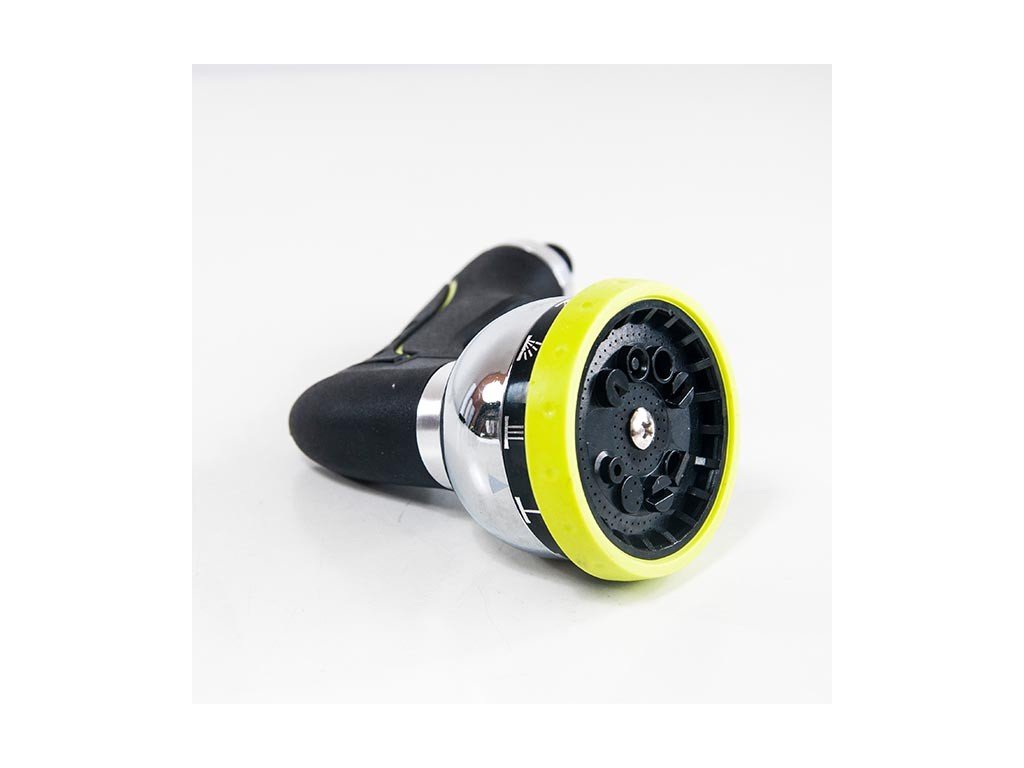 Kovový pistolový rostřikovač masivní konstrukce v kombinaci s plastovými prvky. Má 10 funkcí od jemného zavlažování až po silný proud s možností rychlého přestavení. Aretace spouště pro trvalý postřik.
