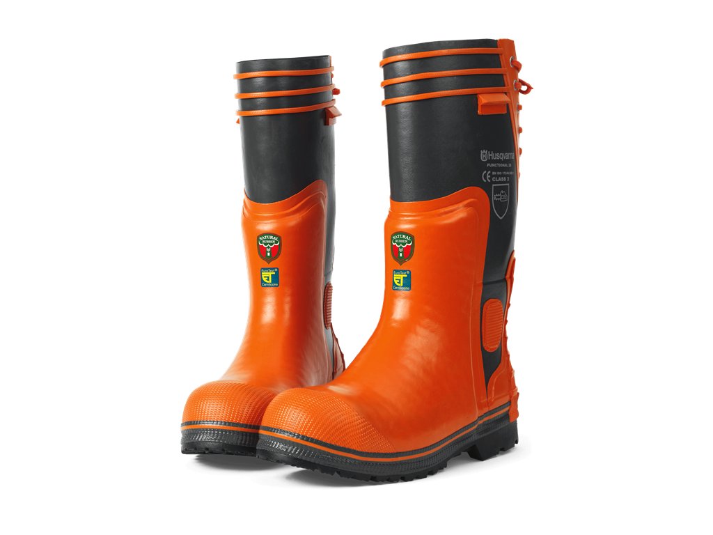 Ručně vyráběná obuv se schválenou ochranou proti proříznutí. Obzvlášť zesílený svršek, ocelová špička boty a zesílené okolí podešve. Šněrování a vroubkování na zadní straně a tvar podpatku usnadňují obouvání a vyzouvání boty. Plátěná podšívka. Podrážka je přizpůsobená pro hroty.