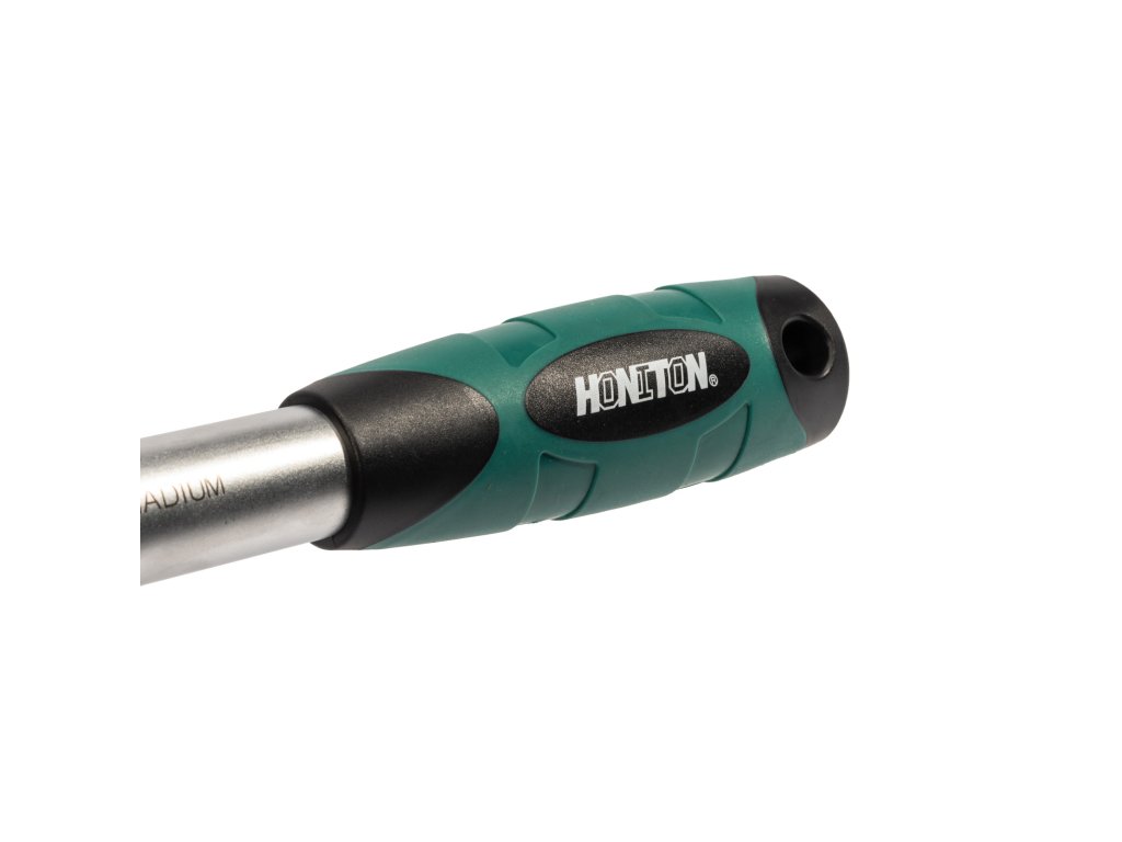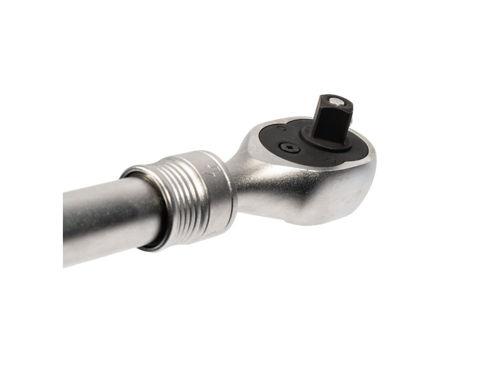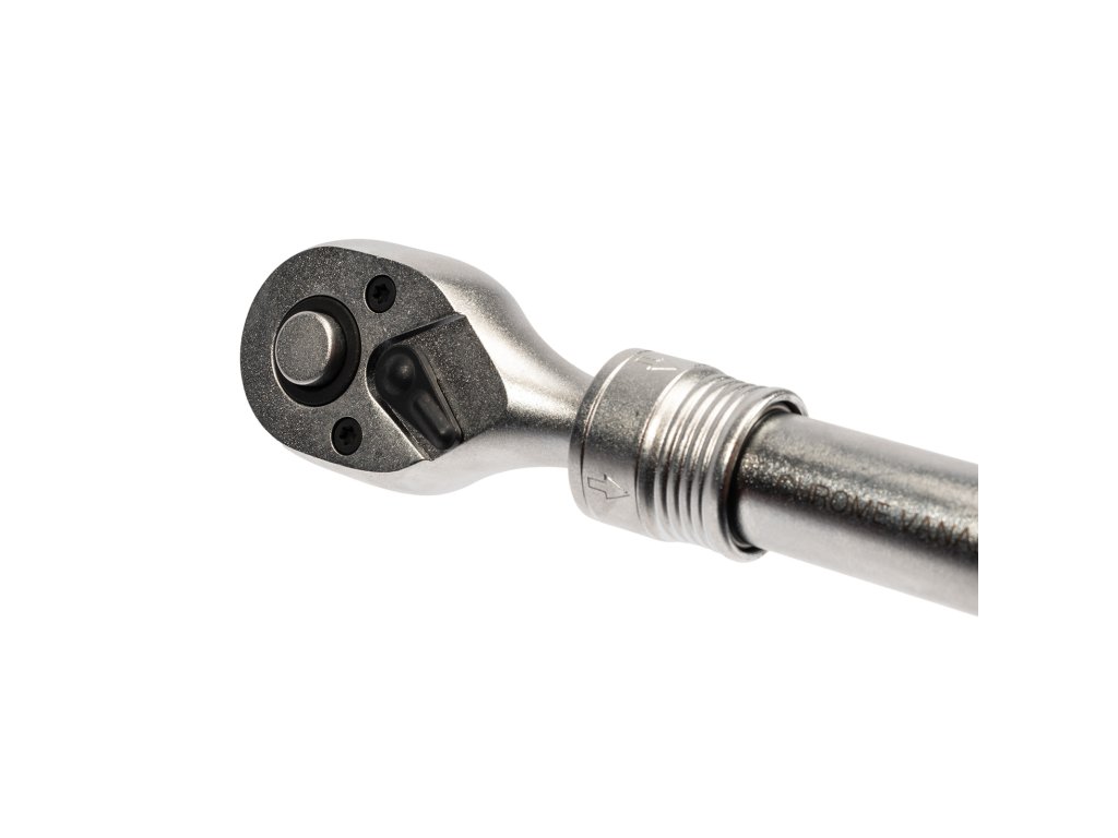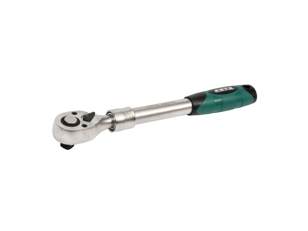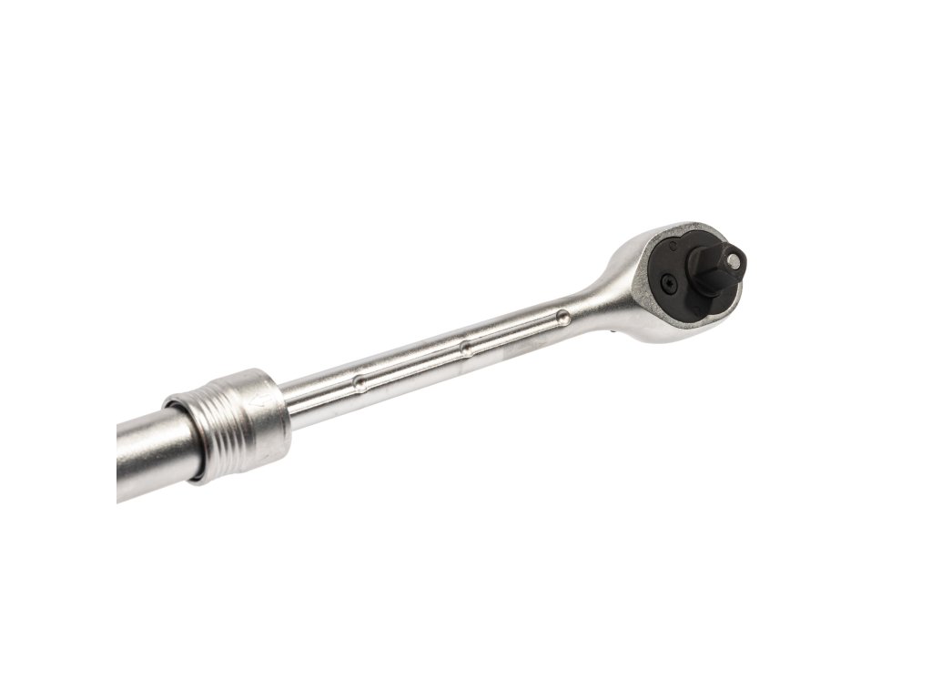 Ráčna teleskopická s pogumovanou rukojetí, kterou lze pomocí uvolnění aretace prodloužit cca o 100mm a tím zvýšit pákový efekt při utahování.