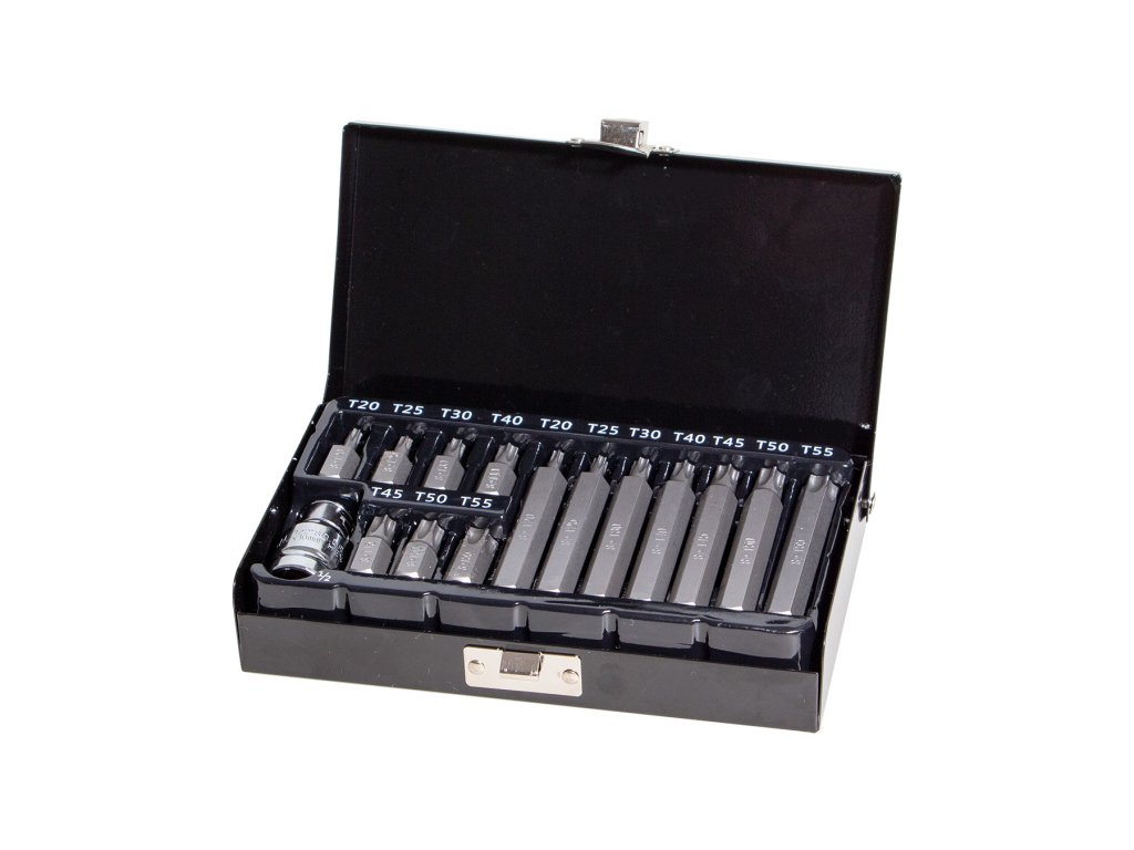 Sada bitů Torx 15 dílů je užitečným pomocníkem pro povolování, nebo utahování šroubů s vnitřním tvarem hlavy TRX, tzv. torx, neboli hvězdička. Umožňuje ale šroubovat i vruty do dřeva, kovu, plastu, či jiných stavebních materiálů. Díky své všestrannosti si nalezla cestu k mnoha našim zákazníkům, ať už kutilům či profesionálům. Bity jsou vyrobeny z chrom-vanadiové oceli a jejich jednotlivé tvary jsou speciálně frézovány tak, aby garantovali maximální výdrž, přesnost a kvalitu při používání. Díky 1/2“ redukci, lze 10 mm bity bezpečně a komfortně umístit do ráčny, nebo vratidla a práci s nimi tak maximálně urychlit.