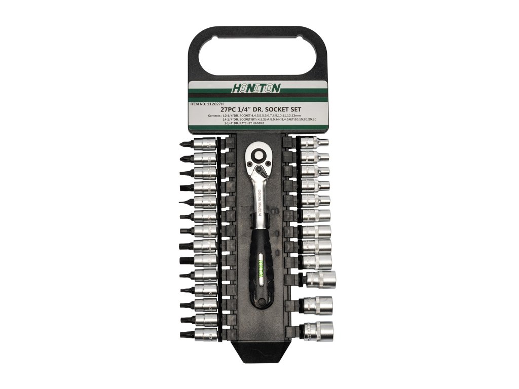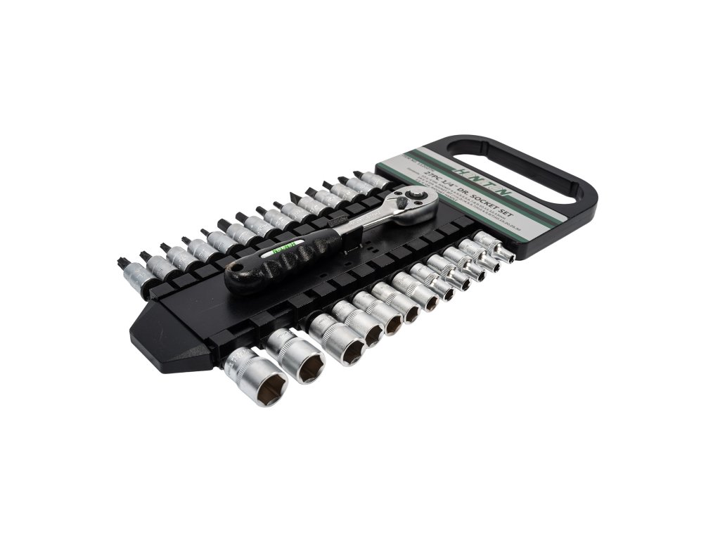 Sada 1/4" hlavic 4-13mm, nástrčných PH,PL,IMB a TRX hlavic a ráčny na plastovém držáku.