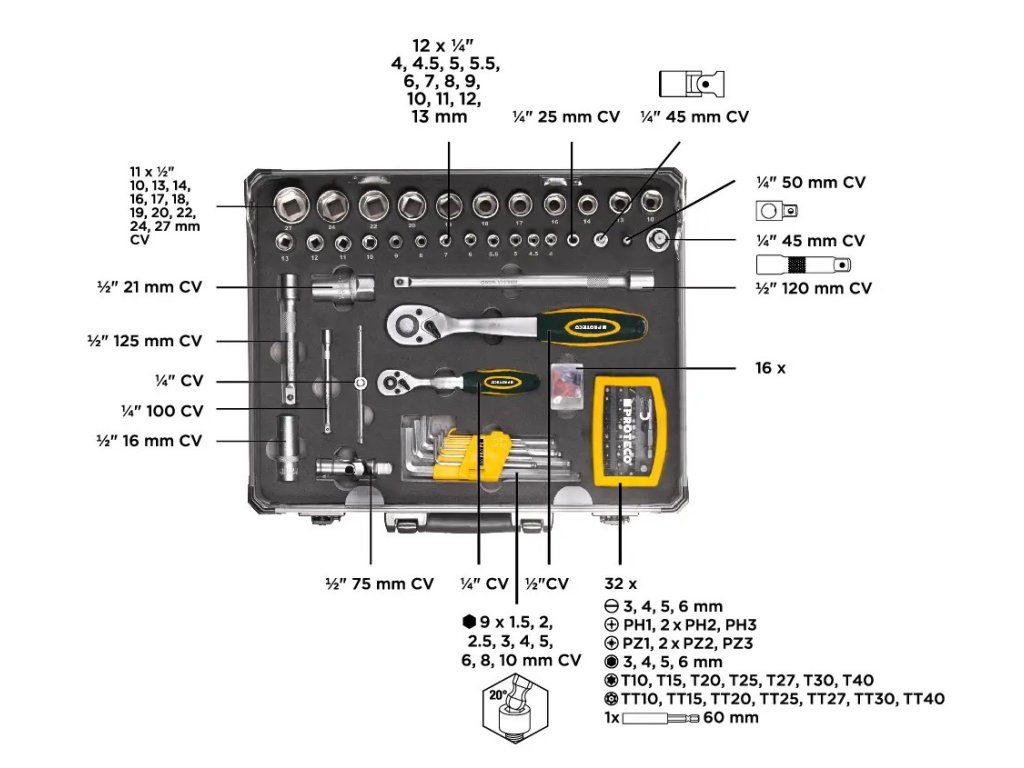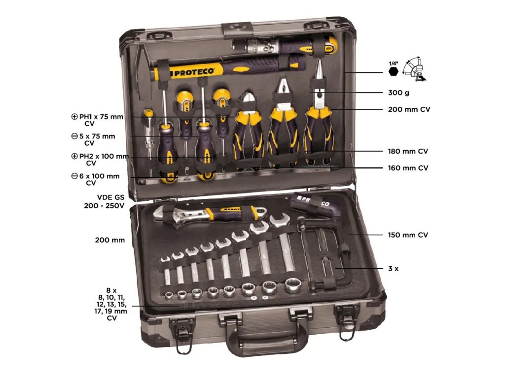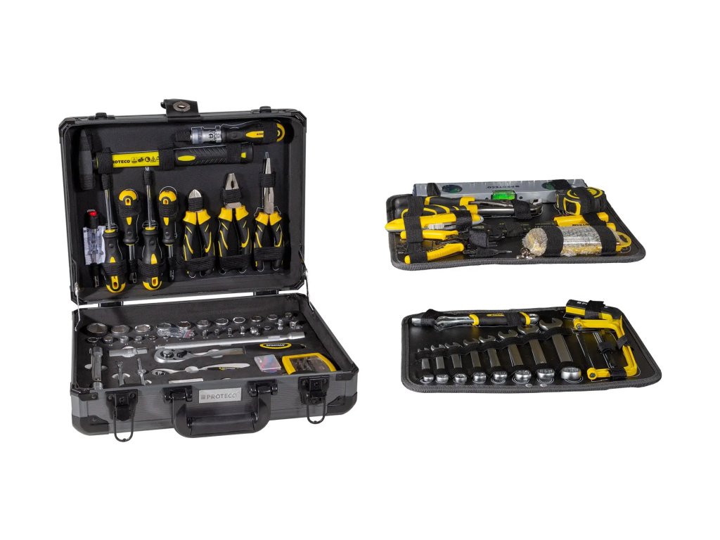 Sada nářadí v kufru 129 dílů obsahuje široké portfolio nářadí, které se hodí pro běžnou údržbu v dílně, domě i na cestách. Sada obsahuje základní nářadí v počtu 129 dílů. Sada je uložena v kvalitním kovovém kufru a jednotlivé nářadí je fixované, aby se při transportu nehýbalo a zůstalo na svém místě.Sada obsahuje