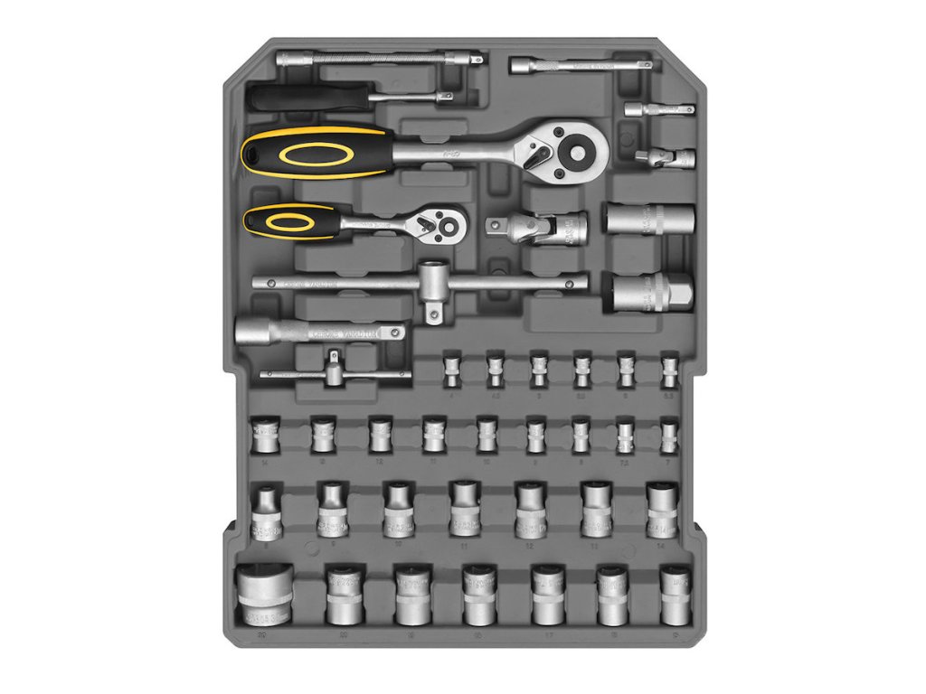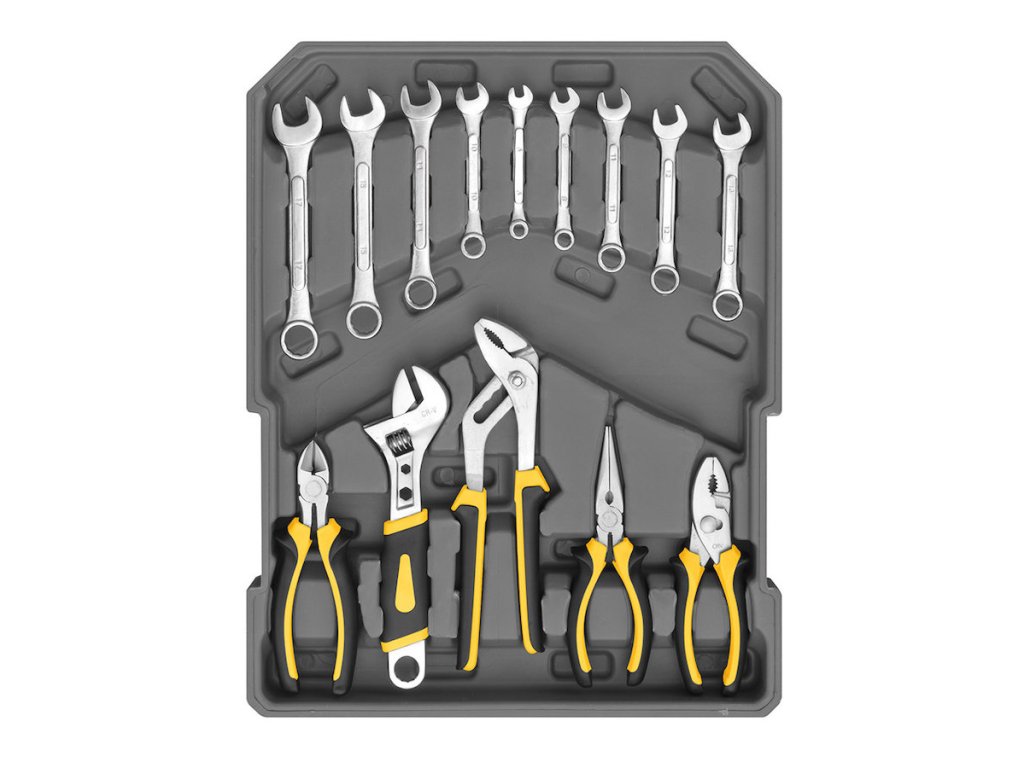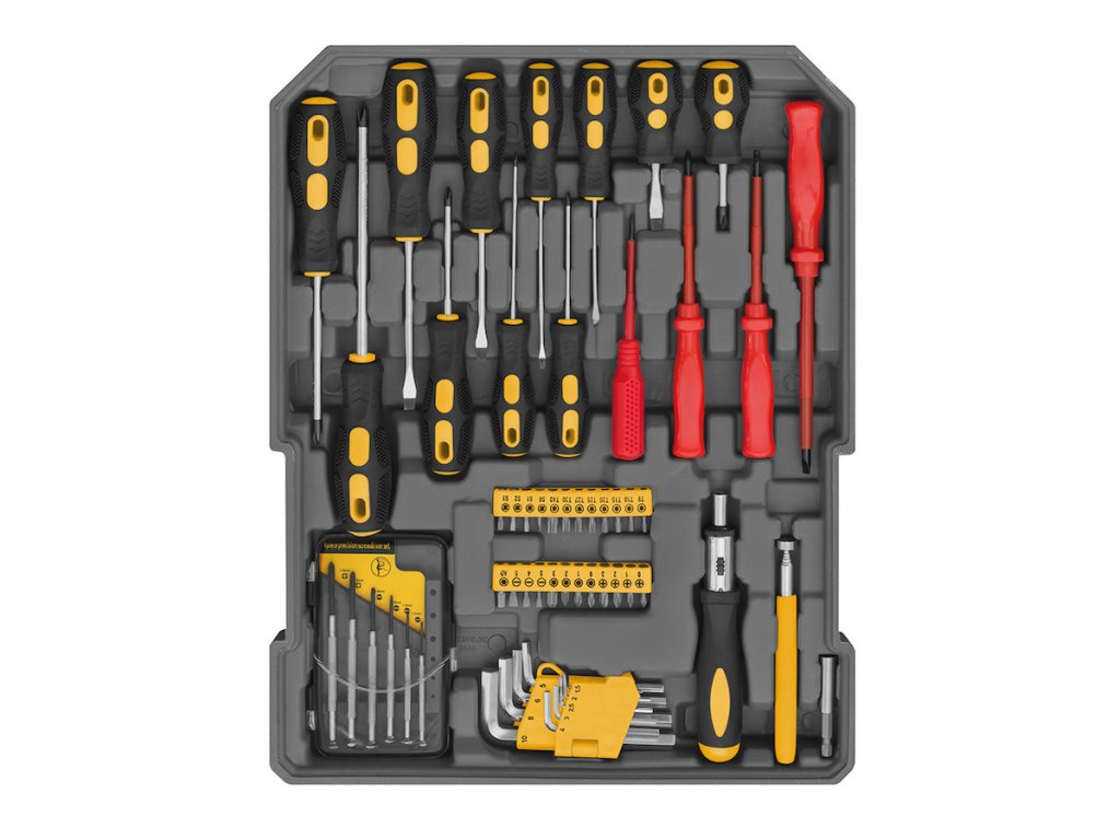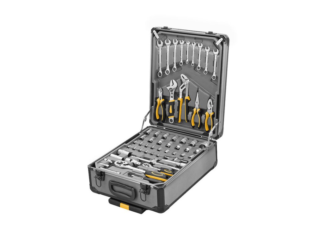 Sada nářadí v kufru na kolečkách 245 dílů je pomocníkem pro běžnou údržbářskou, ale i tvůrčí práci doma, v dílně nebo na zahradě. Jedná se o obsahově velkoryse vybavenou sadu ručního nářadí z vysoce kvalitní chrom-vanadiové oceli. V praktickém, kompaktním a zároveň vysoce odolném hliníkovém kufru na kolečkách lze tak získat nepřeberné množství hlavic, klíčů, kleští, šroubováků a mnoho dalšího nejpoužívanějšího nářadí, které díky precizně tvarovaným výplním zůstane vždy na svém místě.