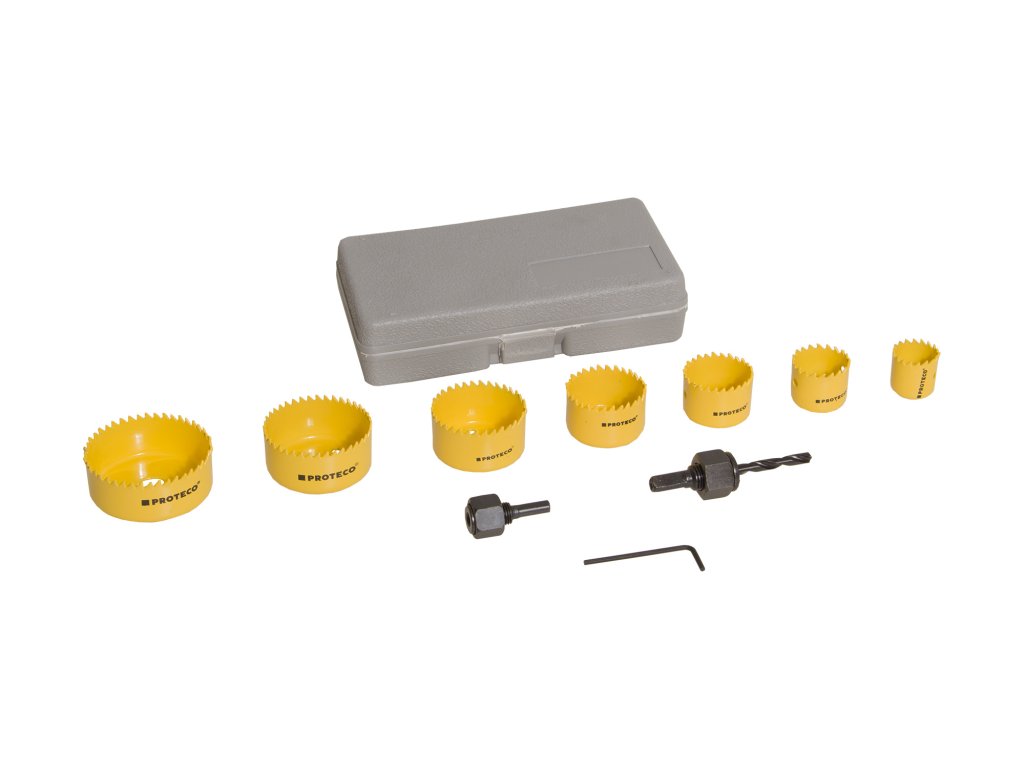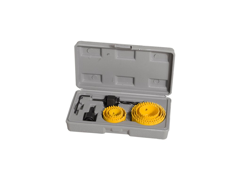Sada vykružovacích pil z rychlořezné oceli (HSS) v kufru. Sada je určena pro vrtání do měkkého i tvrdého dřeva a sádrokartonu. Součástí sady je i držák vykružovacích pil se šestihrannou stopkou.