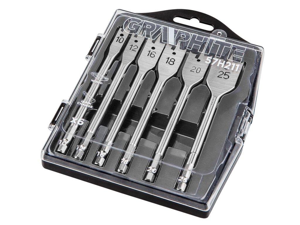 Sada plochých vrtáků do dřeva GRAPHITE (ref. č. 57H211) o průměrech 6.0 mm do 25 mm, díky speciálnímu profilu čepele umožňují zdvojnásobit rychlost vrtání a vyhnout se efektu vytrhávání materiálu. Šestihranná stopka typ „Quick Change“ umožňuje použít vrták v magnetických držácích akumulátorových šroubováků.