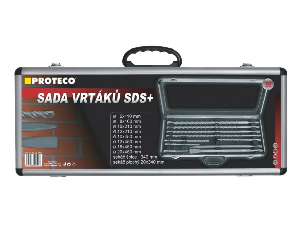 Sada vrtáků a sekáčů 10 dílů je obsáhlou sadou vrtáků a sekáčů s SDS+ upínáním. Je tak ideální a kompaktní pomocník pro vrtání otvorů do betonu, kamene i zdiva. Každý vrták ze sady vrtáků a sekáčů je vyroben z kvalitní chrom-vanadiové oceli, garantující vysokou odolnost proti opotřebení. Speciální tvar ramen vrtáku a přesné broušení, umožňuje komfortní nasazení a dramaticky zkracují dobu potřebnou k vrtání. SDS vrtáky i SDS sekáče jsou bezpečně uloženy v praktickém a vysoce odolném hliníkovém kufru, kde tak má každý vrták i sekáč nejen své místo, ale je tak zároveň chráněn proti mechanickému poškození.