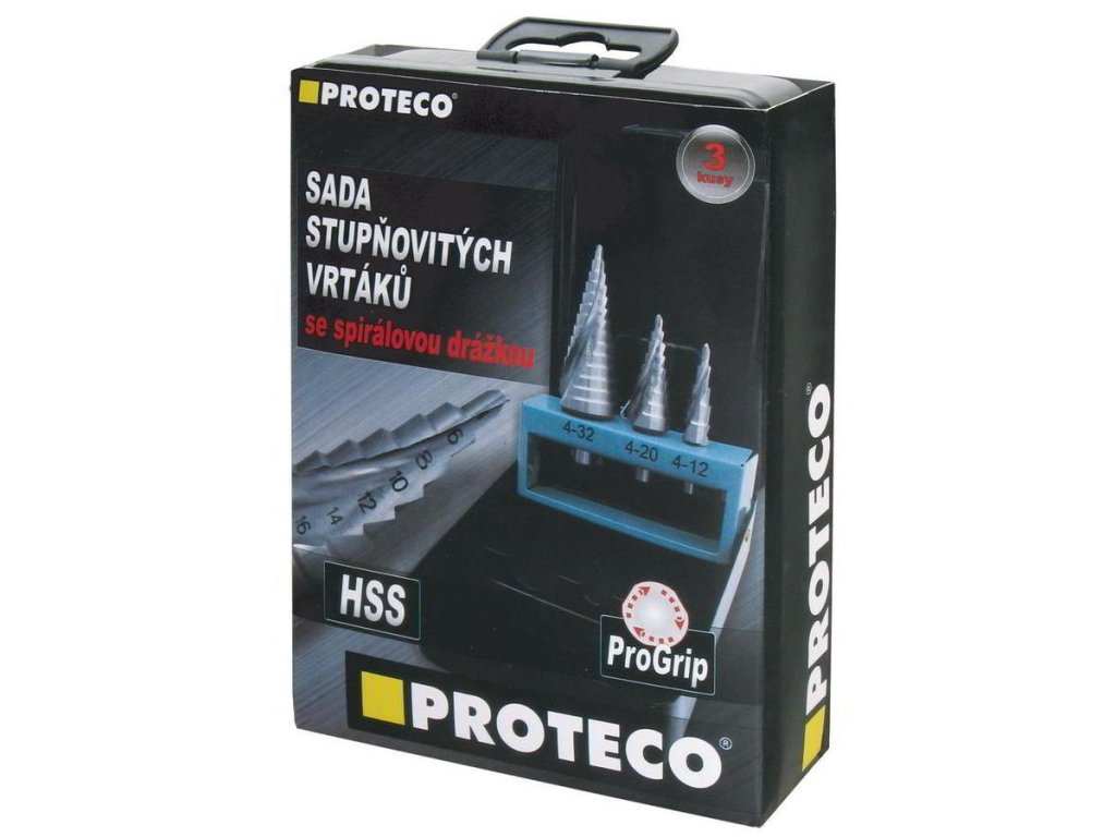 Sada stupňovitých vrtáků HSS spirálová drážka obsahuje 3 stupňovité vrtáky se spirálovou drážkou, tzv. stromečky těchto rozměrů: 4-12 mm, 4-20 mm, 4-32 mm s krokem stoupání 2 mm. Díky svému kvalitnímu zpracování je ideální pro vrtání otvorů do plechů z prakticky všech běžných průmyslových materiálů, jako jsou např. železo, ocel, litina, hliník, měď, dural a další neželezné kovy, dvouplasty, termoplasty apod. Svým rozsahem využití je tak vhodná pro elektroinstalační, vodoinstalační a další mechanické práce. Stupňovité vrtáky jsou vyrobeny z kvalitní rychlořezné oceli a jsou vybaveny spirálovou drážkou usnadňující odvod špon. Systém upínání ProGrip umožňuje snadné, pevné a kvalitní upnutí ve sklíčidle.