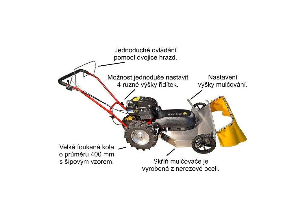 Stroj má dělenou nápravu, která drží při zapnutém pojezdu mulčovač ve směru mulčování a nevybočuje na nerovnostech, ale umožňuje snadné zatáčení.