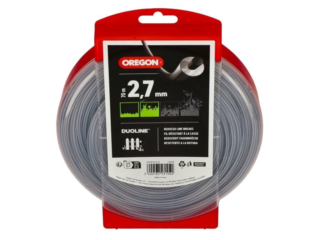 - Složení struny Oregon Duoline: 30% tuhé karbonové jádro a 70% pružnější vnější plášť (umožňuje snáze absorbovat nárazy a snižuje riziko očka žací hlavy).