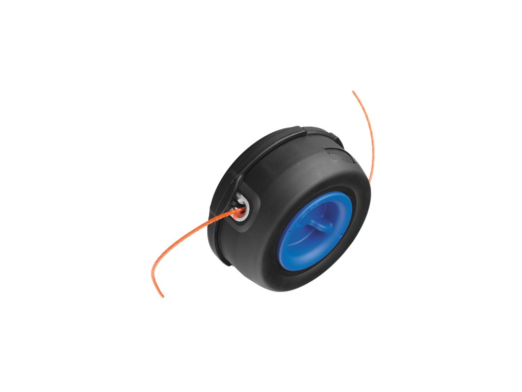 Strunová hlava s ručním posuvem. Vyžínací struna je vysouvána uživatelem po stlačení knoflíku pro ruční posuv a zatažení za strunu.