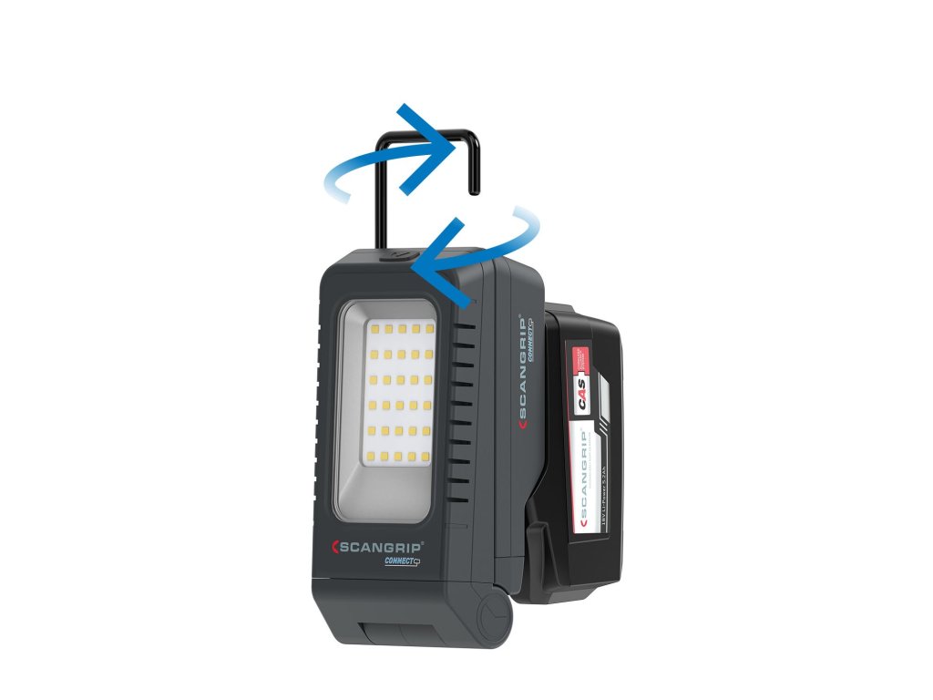 Pro flexibilní zavěšení použijte výsuvný kovový hák. Hák lze otočit o 360° pro flexibilní polohování. Pro BASIC CONNECT je charakteristické zejména to, že hlava lampy má rotaci ve dvou osách. To znamená, že hlava lampy je ohebná o 180° ze složené polohy. Hlavu lampy lze navíc otočit o 180° do stran, což poskytuje zcela flexibilní umístění světla.