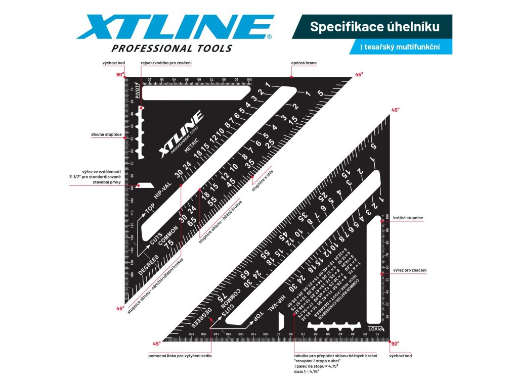 Ostatní vlastnosti | vodítko pro kotoučovou pilu, stupnice pro přenášení úhlu sklonu krokví, rejsek s praktickými zářezy pro tužku, nastavení hloubky řezu, úhloměr, úhel 45° / 90° |