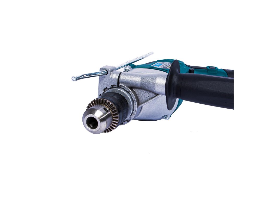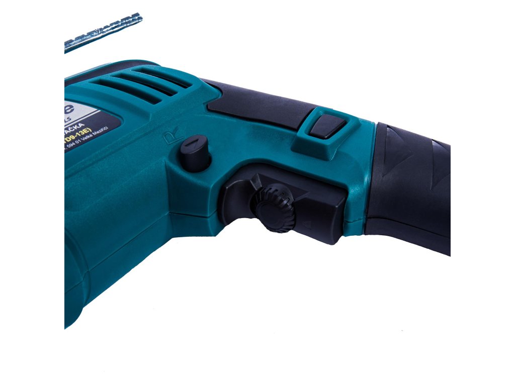 Příklepová vrtačka s kovovým sklíčidlem a přední části těla slouží pro přesné, snadné vrtání do všech materiálů, díky příklepu i do stavebních materiálů. Vrtačka je dobře ovladatelná díky velkým vypínačům, přepínači směru chodu a plynulé regulaci otáček.