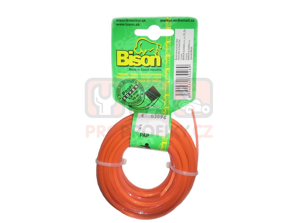 BISON SUPER PROFI je profesionální struna čtvercového průřezu, vyrobená z tvrzeného nylonu „kopolyamidu“, materiálu s trvanlivostí vysoko převyšující prodávané silonové a standardní nylonové struny na našem trhu. Navíc je struna chráněna na povrchu elastickou vrstvou – pancíř odolný vůči nárazům, oděru a tavení. Čtvercový hranatý profil snadněji seká trávu a šetří motor stroje.