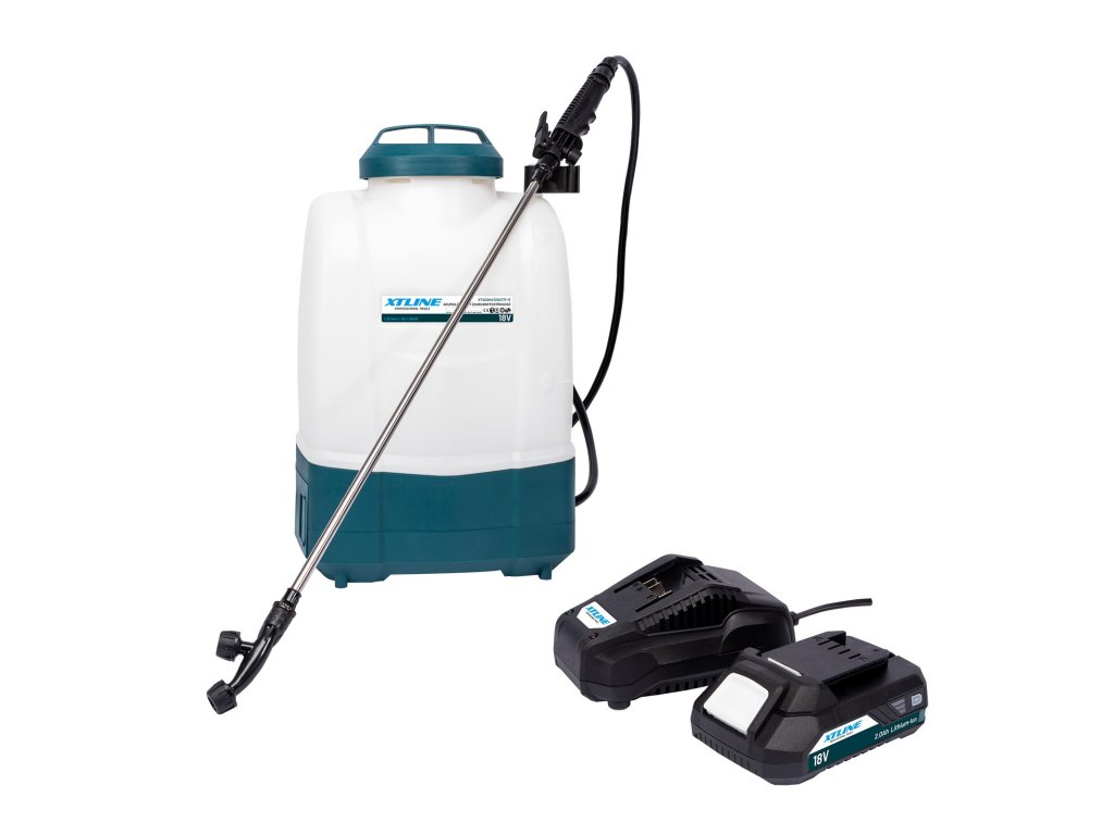 Zádový postřikovač XTline aku 18 V (2x baterie 18 V 2,0 Ah a nabíječka 2,4 A)
